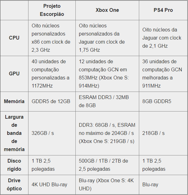 Primeiro, aqui estão as especificações em relação ao original Xbox One e PlayStation 4 Pro:
