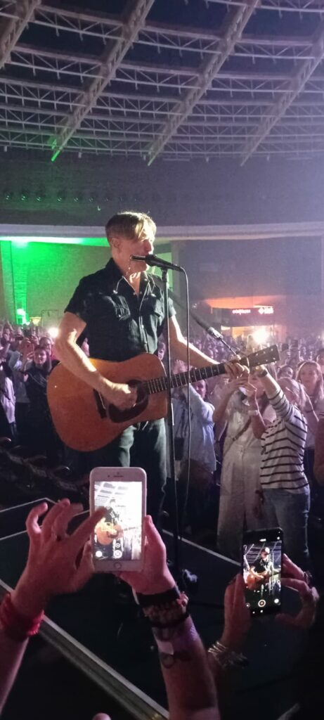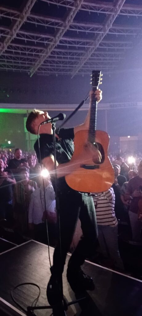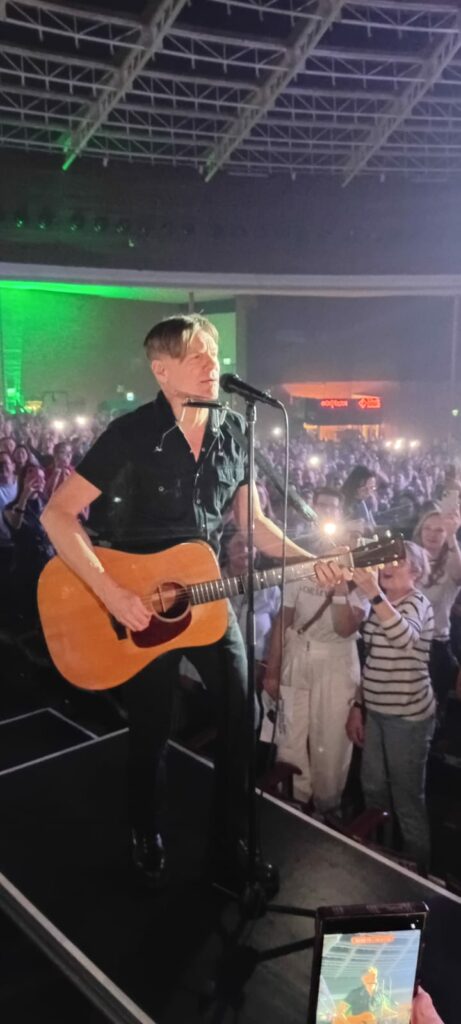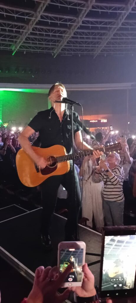 Outra curiosidade interativa é que todo mundo que entrou lá tinha uma pulseira de led, que mudava de cor conforme a ocasião, colorindo de vermelho, branco e azul conforme a canção, naquela vibe meio Coldplay, mas valeu pelo souvenir… Seguindo o show, ele apresenta Never Ever Let You Go, do último álbum, volta para a 1983 com a hard pop This Time e segue para 1987 com Heat Of The Night. Make Up On Your Mind é mais uma do disco de 2025 apresentada. De 2015, manda bala com You Belong To Me, pedindo pro câmera ir atrás de pessoas na plateia que estavam sem camisa! E segue o show com a trilha sonora do filme Don Juan de Marco, indicada ao Oscar, Have You Ever Really Loved A Woman. A música é de 1994 e Adams parece que está em 1994, tamanha perfeição vocal, para delírio da plateia, que não se senta em nenhum momento. Com direito a um carro inflável voando pelo Araújo, o canadense segue o baile com So Happy It Hurts. Segue apresentando novas canções como Will We Ever Be Friends Again do ano passado. Here I Am, mais uma balada com cara de hard rock de 2002, é tocada com ele ao violão e o pianista Gary Breit, e segue no formato acústico com When You’re Gone, com aquela que fez sucesso na época Spice Girl, Mel C., em uma grande passagem do show.