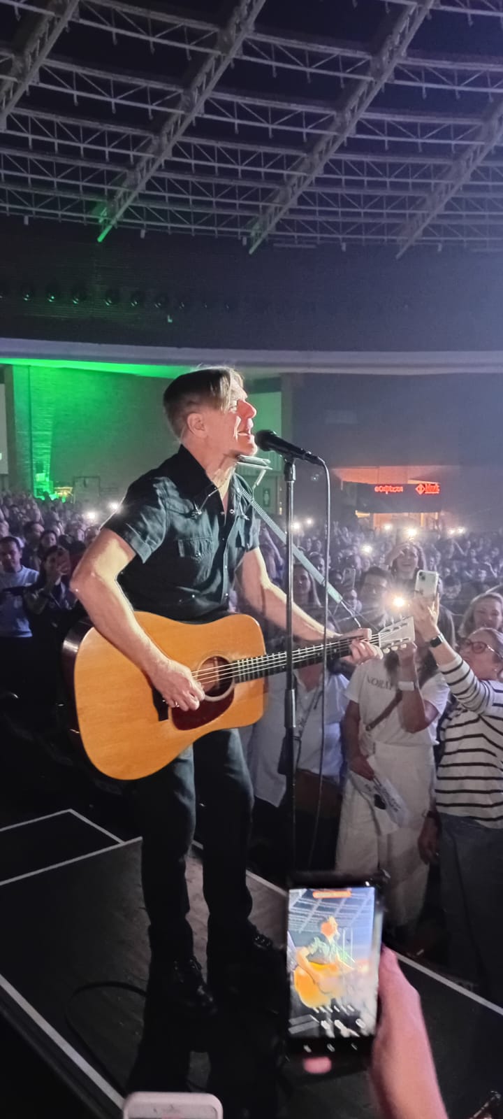 Depois de três shows pelo Brasil, chegou a vez do cantor desembarcar em Porto Alegre para apresentar a turnê Roll With The Punches para os gaúchos. O nome vem do décimo-sexto álbum de estúdio do artista. Nos shows anteriores tínhamos a informação que ele iria começar o show literalmente no meio da galera. Um praticável estava pelo meio do auditório, dando a pista que seria ali que começaria o show. Por volta das 21h20min, ao soar um gongo (no ritmo do nome da tour), surge o cantor com um pedestal, munido de um violão e começa a cantar Can’t Stop This Thing We Started, de 1991. Eu fiquei a três metros do artista, e ele com total tranquilidade, com um ou dois seguranças em distância boa para conter possíveis interferências, leve e solto, cantou ali mesmo no meio da galera. Segue ali com a linda Straight From The Heart do álbum Cuts Like A Knife, de 1983, e fechou esse inusitado e histórico início de show com Let’s Make A Night To Remember, balada de 1996.