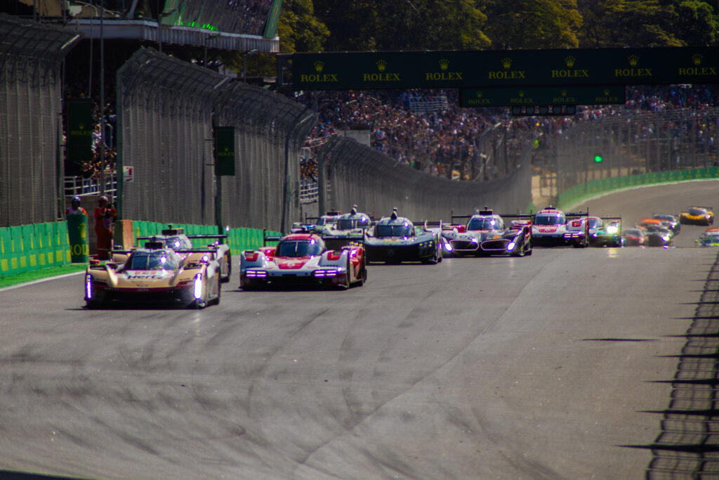 A largada coube a Rubens Barrichello, que balançou a bandeira verde sob aplausos antes de correr para a mureta e acompanhar o Aston Martin Vantage AMR #10 pilotado pelo filho. Eduardo Barrichello, pole da LMGT3 na véspera, iniciava ali uma jornada que atravessaria dramas e euforias. Na primeira volta da prova principal, porém, o foco mudou para a categoria Hypercar: Julien Andlauer mergulhou o Porsche #5 por dentro do Cadillac V‑Series R #12 no “S do Senna” e assumiu a liderança, insuflando expectativa no público que aguardava um confronto duríssimo entre as montadoras favoritas.