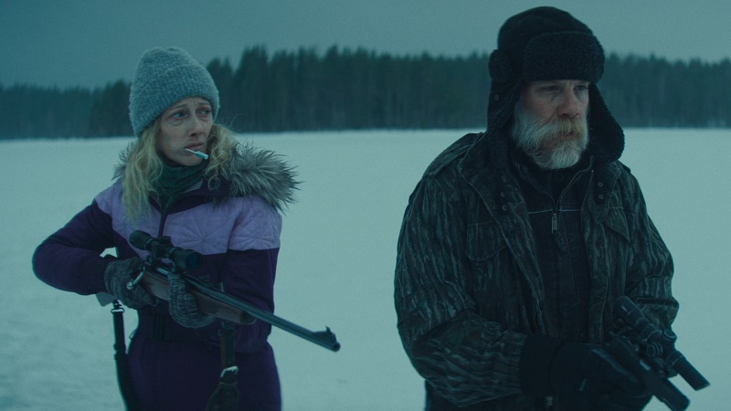 Se o filme tem algum mérito, é a maneira precisa como o diretor Kirk nos apresenta aquela imensidão de gelo inóspito e pouco agradável daquela região do Norte dos Estados Unidos. Usando a natureza e seus perigos como cenário perfeito, influindo inclusive no psicológico, tanto das vítimas quanto dos algozes. Mas infelizmente tudo para por aí. O filme tenta, usando de flashbacks, contar a encantadora história de amor de Barb e Karl, que teve início nos idos dos anos 1980, e mostra como ela sempre foi uma mulher forte e aprendeu muito com seu companheiro a enfrentar intempéries selvagens. Menos mal, porque só assim para acreditarmos que uma simples foresteira iria atirar tão bem, fazer armadilhas infalíveis e conseguiria fazer pontos em si mesmo depois de levar um tiro. Quase que uma super Emma Thompson enfrentando o casal, a cruel e doentia mulher da jaqueta roxa e seu marido banana, o cara da jaqueta camuflada.