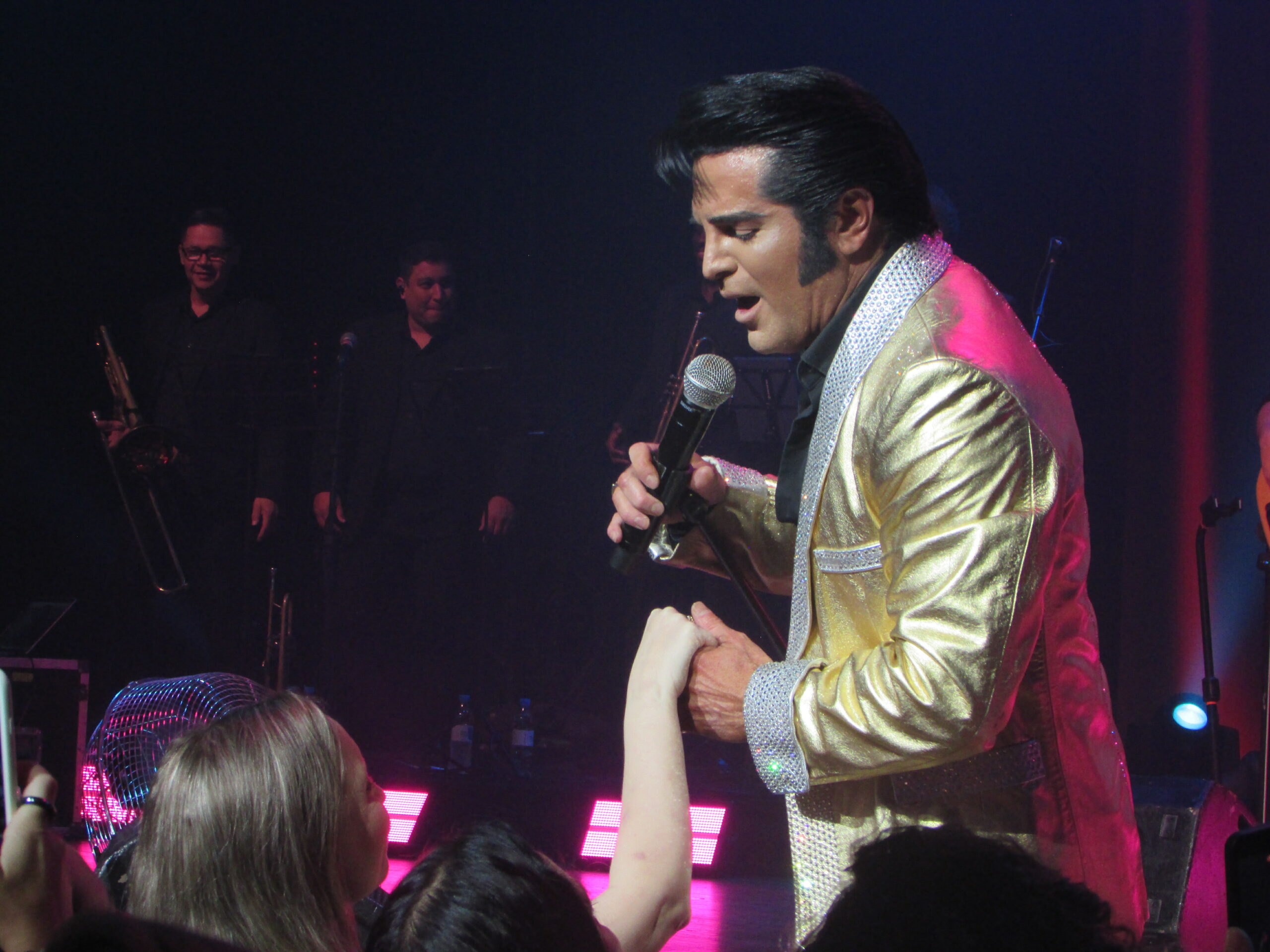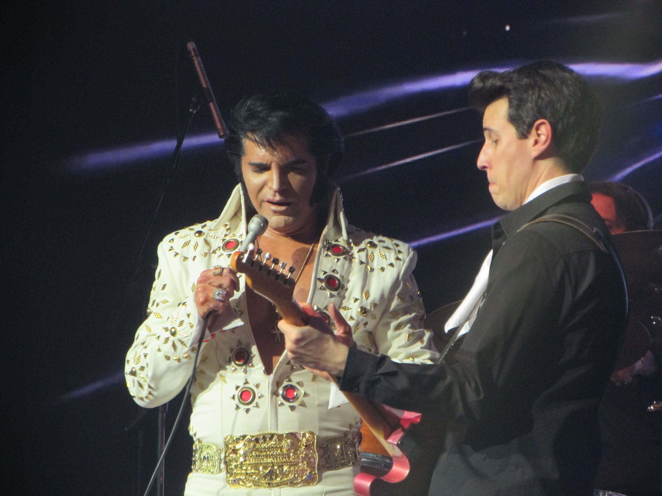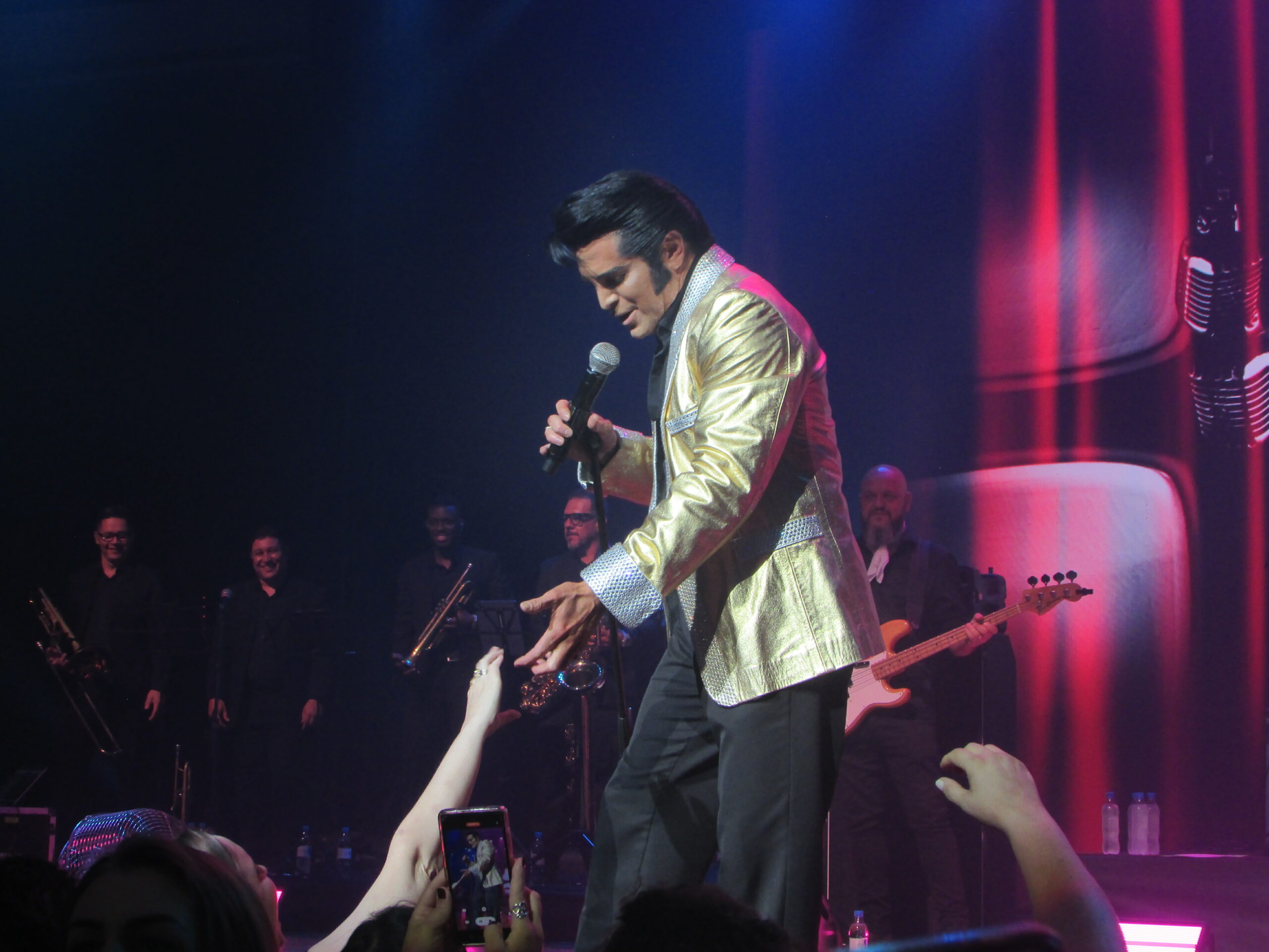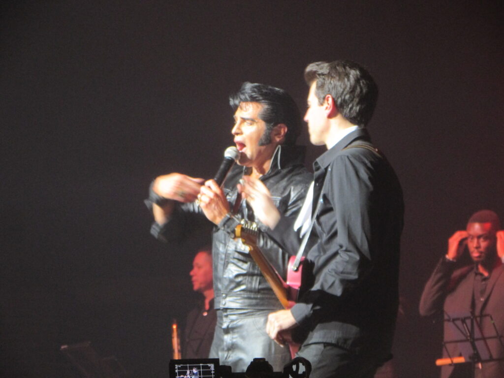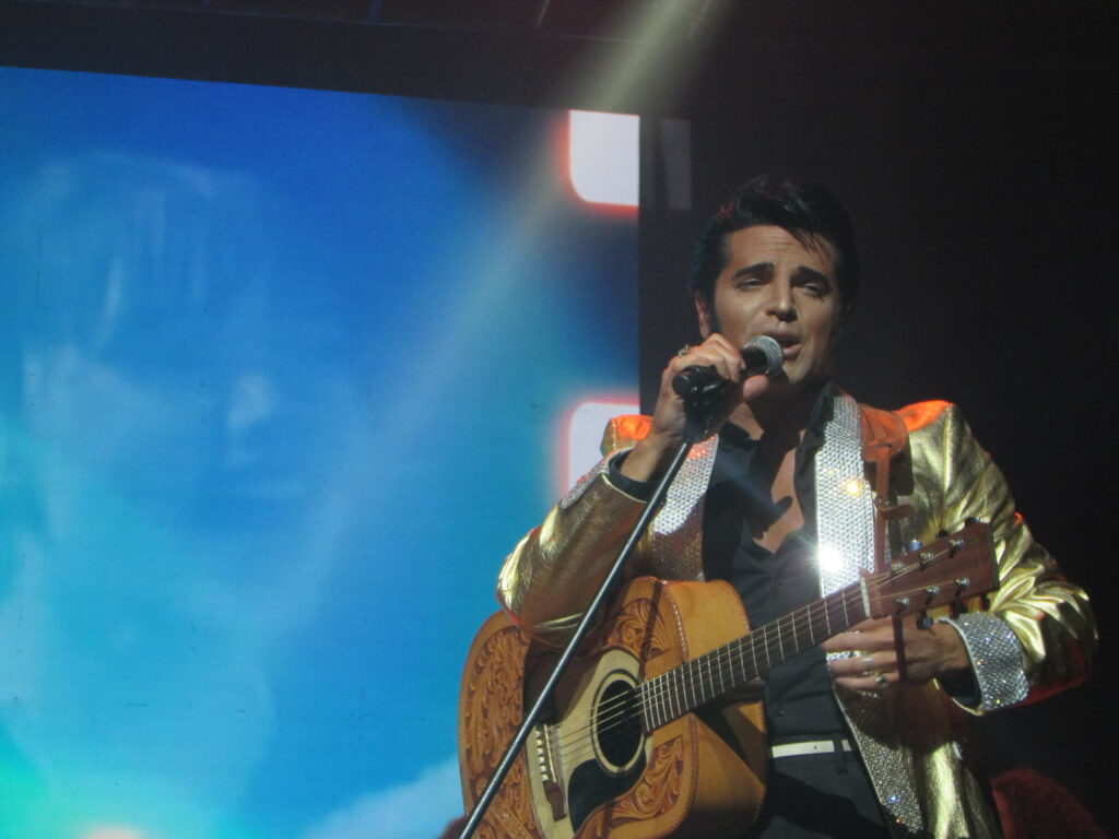 Passando aquela fase esquecível dos anos 1960, com seus filmes medonhos e músicas pavorosas, ele volta em grande estilo, todo de couro, com o lendário espetáculo de 1968, Comeback Special, que literalmente foi a ressurreição de Elvis para a música. Começando com um medley com Heartbreak Hotel, Hound Dog e All Shook Up, seguido por canções marcantes como A Little Less Conversation. Mas nesse meio tempo, Dean Z falou em português, “macetou”, sambou, falou de sua paixão pela guaraná Fruki e comeu uma bergamota no palco. Ele dividiu a fruta com seu guitarrista Heitor e ainda mandou gomos para a plateia. Mais uma prova da simpatia única do cantor. E não só simpatia ele tem. Além de uma semelhança incrível com o cantor (é só um pouco mais baixo, mas ninguém é perfeito), figurinos impecáveis, tem um vozeirão muito semelhante, além de fazer um show físico, onde dança, pula, senta no chão, literalmente não para, em sua atuação de palco visceral. As três canções em sequência são de arrepiar, Memories, Rubberneckin e a antológica If I Can Dream, em que divide os vocais com Elvis, que surge num telão ao fundo num momento arrepiante do show.