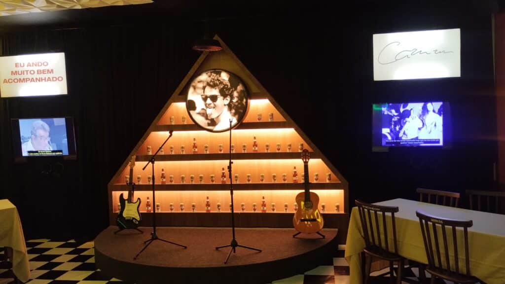 Uma das fachadas é da Pizzaria Guanabara e é também a entrada da última sala da exposição. Onde, na recriação da famosa pizzaria, o visitante pode se sentar em uma mesa e escolher depoimentos de pessoas próximas a Cazuza, para “trocar aquela ideia” sobre o artista.