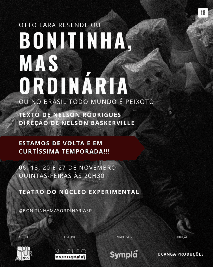 A distópica Otto Lara Resende ou Bonitinha, mas ordinária ou no Brasil todo mundo é Peixoto volta em cartaz em curta temporada: de 6 a 27 de novembro, no Teatro do Núcleo Experimental. Dirigida por Nelson Baskerville, o espetáculo parte de um dos maiores clássicos de Nelson Rodrigues (1912-1980) para criar um espelho cruel das hipocrisias brasileiras.