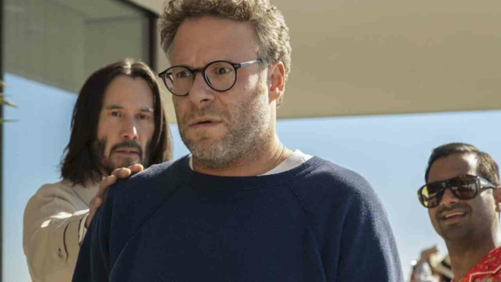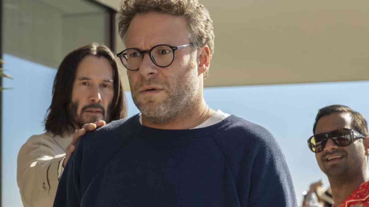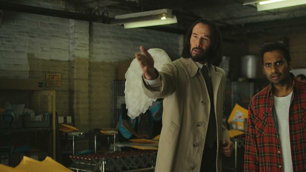 E como tinha falado no início do texto, um time desses a gente espera ao menos uma sessão de besteirol e boas gargalhadas. Mas aí que mora o problema do filme, se ri muito pouco. Não que não tenham piadas e tiradas, mas elas pouco funcionam. Aziz é um cara engraçado, mas sua mutação da sua miserável vida para uma vida cheia de luxos e lazer materiais rende pouca graça e Seth Rogen apresenta incrivelmente esta política do meme correto demais e com péssimo timing de piadas. Keke Palmer faz Elena, a namorada ativista de Arj, que trabalha numa loja de ferramentas e vive na luta por melhorias nas condições de trabalho da empresa e Sandra Oh é uma espécie de mentora dos anjos, fiscalizando os seres celestiais. Mas quem realmente faz o filme valer ser conferido é Keanu Reeves. O ator está ótimo como um anjo com pequenas asas e bom coração, que acaba se sensibilizando com a perdida alma de Arj e resolve largar tudo para ter uma vida terrestre. Na experiência mundana ele se apaixona por hambúrgueres, tacos, se torna um fumante inveterado, aprende a dançar e se diverte muito com a sua nova condição. E realmente é o único que diverte no filme, Reeves não se leva a sério demais, livre e solto é responsável pelos momentos mais divertidos do filme.